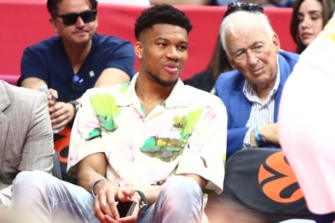 Ο Γιάννης Αντετοκούνμπο βρίσκεται από νωρίς στα επίσημα της Uner Arena και παρακολουθεί τον μικρό τελικό μεταξύ Ολυμπιακού και Φενερμπαχτσέ.