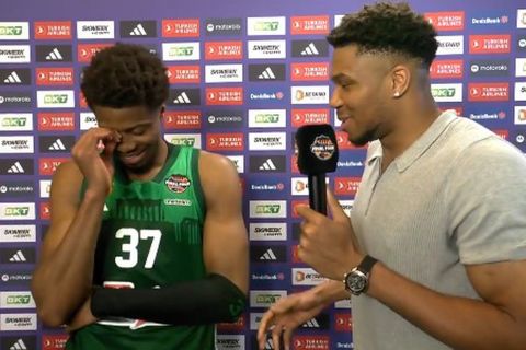 Ο Κώστας Αντετοκούνμπο πανηγυρίζει την πρόκριση του Παναθηναϊκού στον τελικό της Euroleague, μετά την νίκη της ομάδας του επί της Φενέρμπαχτσε, στον πρώτο ημιτελικό του Final Four, με τον αδελφό του Γιάννη, να εκτελεί… χρέη δημοσιογράφου!