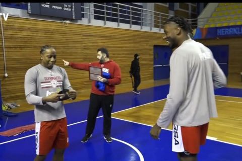 Χαλαρές στιγμές περνούν οι παίκτες του Ολυμπιακού στην τελευταία προπόνηση πριν το παιχνίδι του προημιτελικού του Κυπέλλου Ανδρών, με τον ΜακΚίσικ να συγκρίνει τα μαλλιά των Κάνααν και Ράιτ.