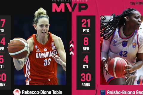 Δύο αθλήτριες, η Ανίσα Τζορτζ και η Ρεμπέκα Τόμπιν μοιράζονται τον τίτλο της ΚΥΑΝΑ MVP της 13ης αγωνιστικής στην Α1 Γυναικών.