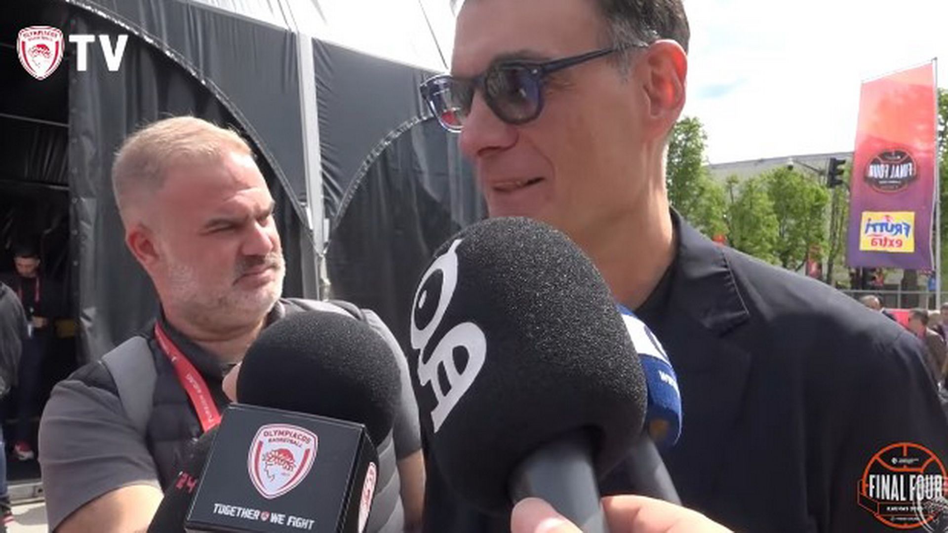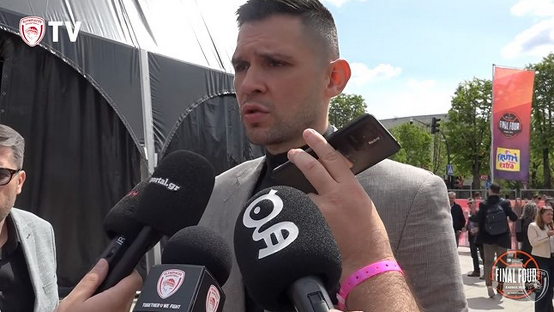 Ο Γιώργος Μπαρτζώκας γνώρισε την αποθέωση από τους φίλους του Ολυμπιακού που τον περίμεναν έξω από την αίθουσα που πραγματοποιήθηκε η συνέντευξη Τύπου του Final Four.