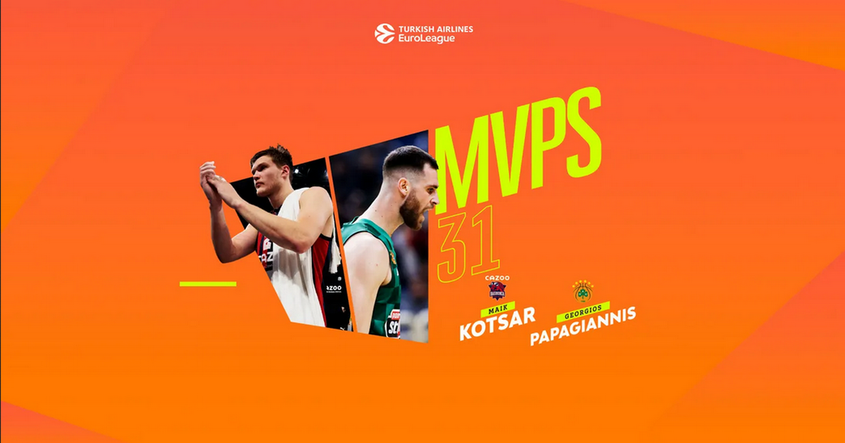 Στα δύο μοιράστηκε το βραβείο της 31ης αγωνιστικής της Euroleague, με τους Γιώργο Παπαγιάννη και Μάικ Κότσαρ να κυριαρχούν.