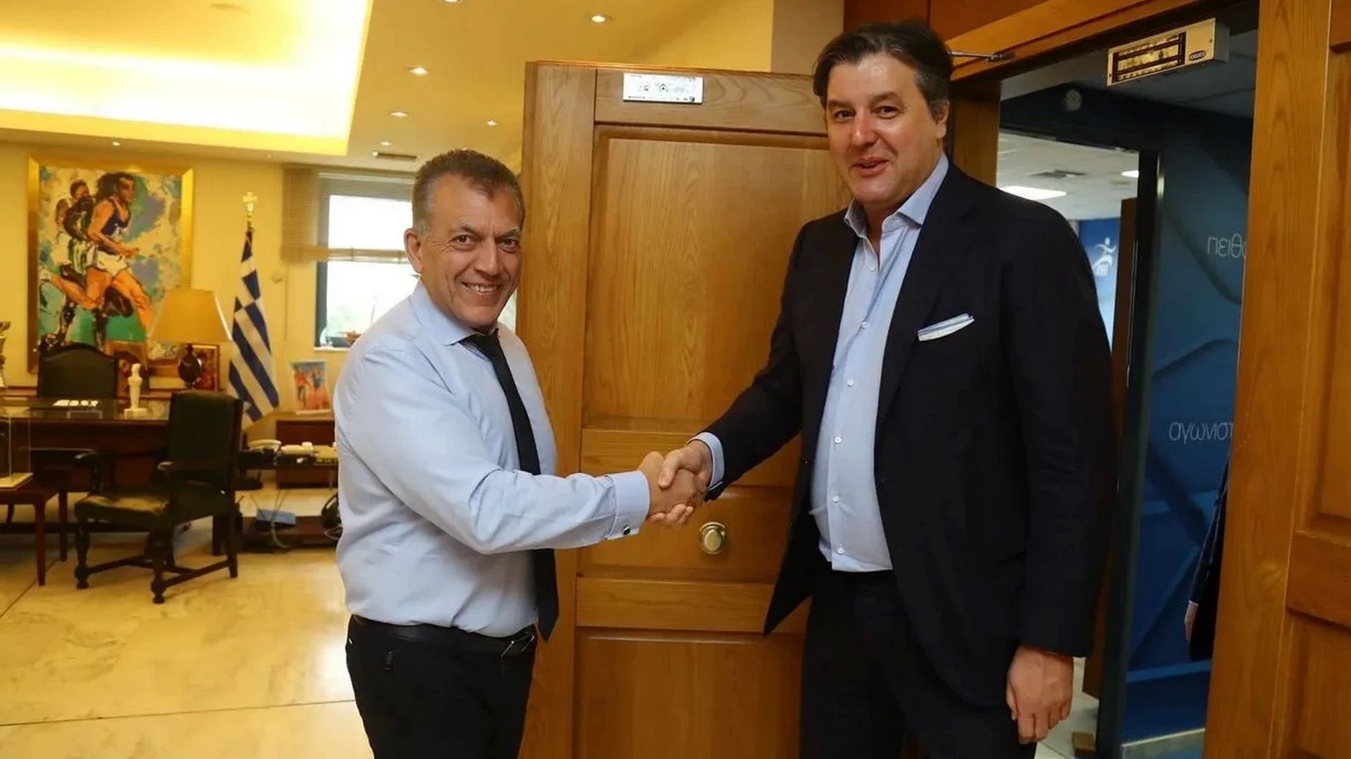 Ο πρόεδρος της Euroleague, Ντέγιαν Μποντιρόγκα, συναντήθηκε με τον Αναπληρωτή Υπουργό Αθλητισμού, Γιάννη Βρούτση, μετά την συνάντηση που είχε με τον Κυριάκο Μητσοτάκη το μεσημέρι της Τρίτης (18/10).