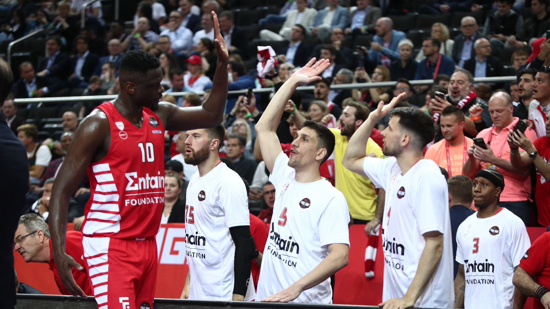 Λίγα δευτερόλεπτα έχουν περάσει από το τέλος του ημιτελικού με τη Μονακό, επί της οποίας ο Ολυμπιακός επικράτησε με 76-62 και ο Σλούκας ξεσηκώνει την ερυθρόλευκη κερκίδα, ενώ οι πρόεδροι της ΚΑΕ Παναγιώτης και Γιώργος Αγγελόπουλος σπεύδουν να συγχαρούν τους αθλητές και το τεχνικό επιτελείο για τους επίτευγμά τους να περάσουν στον τελικό του Final 4 του Κάουνας.