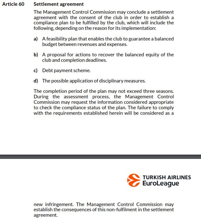 δ) Η ενδεχόμενη εφαρμογή πειθαρχικών μέτρων. Η περίοδος ολοκλήρωσης του σχεδίου δεν μπορεί να υπερβαίνει τις τρεις σεζόν. Κατά τη διαδικασία αξιολόγησης, η Επιτροπή Ελέγχου Διαχείρισης μπορεί να ζητήσει τις πληροφορίες που θεωρεί κατάλληλες για να ελέγξει την κατάσταση συμμόρφωσης του πλάνου. Η μη συμμόρφωση με τις απαιτήσεις που καθορίζονται στο παρόν θα θεωρηθεί ως νέα παράβαση. Η Επιτροπή Ελέγχου Διαχείρισης μπορεί διαπιστώνει τις συνέπειες αυτής της μη εκπλήρωσης στη διευθετημένη συμφωνία».