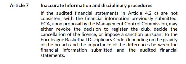 Εάν οι ελεγμένες οικονομικές καταστάσεις του άρθρου 4.2 γ) δεν είναι σύμφωνα με τις οικονομικές πληροφορίες που υποβλήθηκαν προηγουμένως, η ECA μετά από πρόταση της Επιτροπής Ελέγχου Διαχείρισης, μπορεί είτε να ανακαλέσει την απόφαση εγγραφής του συλλόγου, να αποφασίσει την ακύρωση της άδειας ή την επιβολή κύρωσης σύμφωνα με τον Πειθαρχικό Κώδικα της Euroleague, ανάλογα με τη βαρύτητα της παραβίασης και της σημασίας των διαφορών μεταξύ των οικονομικών πληροφοριών που υποβλήθηκαν και οι ελεγμένα οικονομικά δηλώσεις».