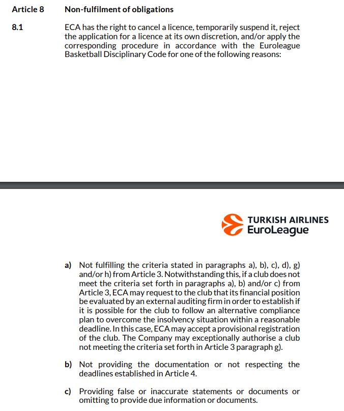 «8.1 H ECA έχει το δικαίωμα να ακυρώσει μια άδεια, να την αναστείλει προσωρινά, να απορρίψει την αίτηση για άδεια κατά τη διακριτική της ευχέρεια ή/και να εφαρμόσει την αντίστοιχη διαδικασία σύμφωνα με την Πειθαρχικό Κώδικα της Euroleague για έναν από τους παρακάτω λόγους: