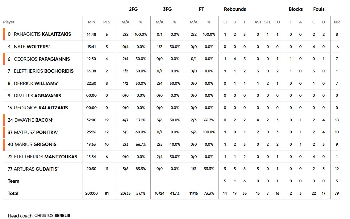 Ο Χρήστος Σερέλης ζητά άμυνα. Οι παίκτες του το άκουσαν ξεκάθαρα και ακόμη καλύτερα το εφάρμοσαν στην πρώτη περίοδο. Προηγήθηκαν στα πρώτα λεπτά (4-8, 2’), είδαν τους Σέρβους να προηγούνται (15-13, 6’10’’), αλλά οι «πράσινοι» είχαν μέτρησαν πέντε κλεψίματα σε αυτό το διάστημα, με την άμυνά τους να προσφέρει εύκολους πόντους ως το 18-28 με το οποίο άνοιξε η δεύτερη περίοδος. O Γκριγκόνις αλάνθαστος ως εκείνο το σημείο οδήγησε στο +11 (20-31, 12’30’’).