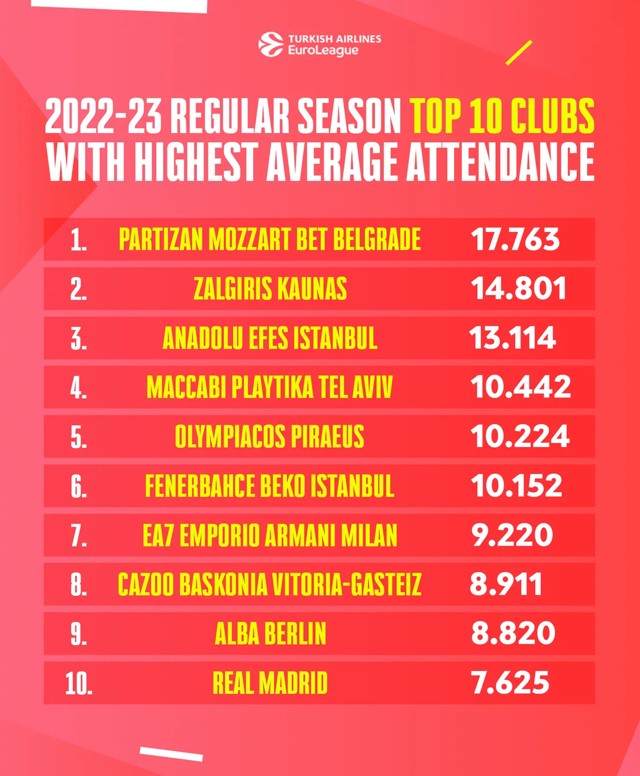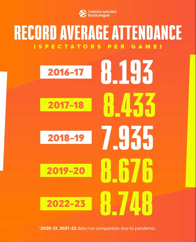 Τέλος, αξίζει να αναφερθεί την εφετινή σεζόν ο μέσος όρος προσέλευσης θεατών ήταν ο υψηλότερος από κάθε άλλη σεζόν με 8.748 να παρακολουθούν κάθε αγώνα της Euroleague στα παρκέ της κορυφαίας διοργάνωσης.