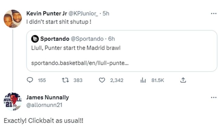 «Εγώ δεν ξεκίνησα τίποτα, σκάστε!» αναφέρει χαρακτηριστικά ο Πάντερ, παραθέτοντας την ανάρτηση του «Sportando», ενώ θέση πάνω στο θέμα πήρε και ο συμπαίκτης του, Τζέιμς Νάναλι, λέγοντας χαρακτηριστικά: Ακριβώς! Clickbait, όπως πάντα!!»