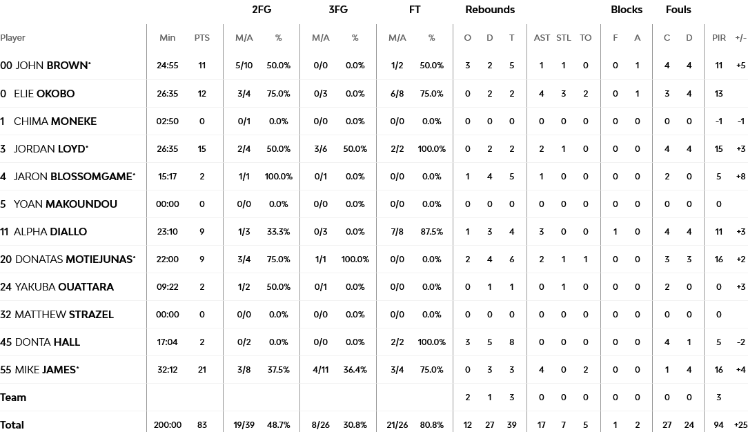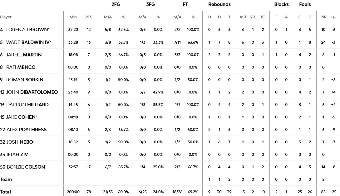 Από πλευράς Μακάμπι, 17 πόντους είχε ο Κόλσον, ενώ ο Μπαλντγουιν πραγματοποίησε «γεμάτη» εμφάνιση με 16 πόντους, οκτώ ριμπάουντ και έξι ασίστ.