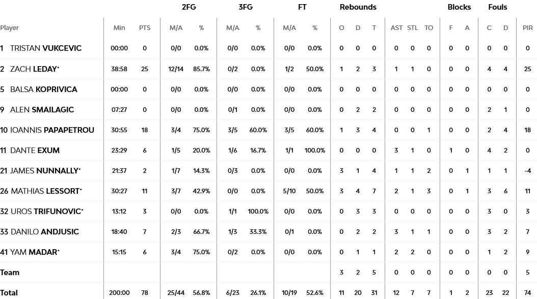 Για την Παρτιζάν, ο ΛεΝτέι έκανε σπουδαίο παιχνίδι με 25 πόντους, με τον Παπαπέτρου να έχει 18 πόντους και τον Λεσόρ 11.