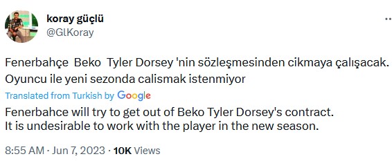 «Η Φενέρμπαχτσε θα προσπαθήσει να βγει από το συμβόλαιο του Τάιλερ Ντόρσεϊ. Δεν αποτελεί επιθυμία της η συνέχιση της συνεργασίας με τον παίκτη τη νέα σεζόν», αναφέρει το… τιτίβισμα του Τούρκου, με τους ιθύνοντες της Φενέρ να μην είναι ικανοποιημένοι από τις εμφανίσεις του Ντόρσεϊ με την φανέλα της ομάδας του Δημήτρη Ιτούδη.