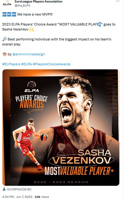 Ακόμα μία διάκριση για τον Σάσα Βεζένκοβ, καθώς, μετά το βραβείο του MVP της Euroleague, ο φόργουορντ του Ολυμπιακού ανακηρύχθηκε κορυφαίος παίκτης της διοργάνωσης και από την ELPA.