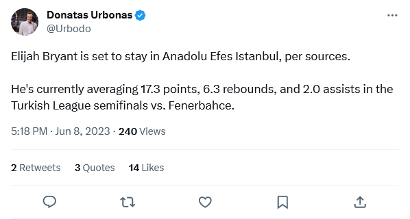 «Ο Ελάιζα Μπράιαντ αναμένεται να παραμείνει στην Αναντολού Εφές, όπως λένε οι πηγές μου. Ο παίκτης μετρά 17,3 πόντους, 6,3 ριμπάουντ και 2 ασίστ στην σειρά των ημιτελικών απέναντι στην Φενέρμπαχτσε», αναφέρει η ανάρτηση του Λιθουανού στο twitter για τον άσο της Αναντολού, το όνομα του οποίου είχε ακουστεί έντονα και για τον Παναθηναϊκό.