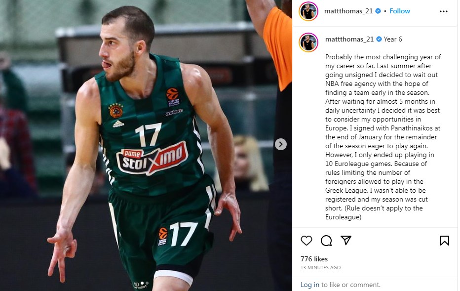 Για τα παιχνίδια που αγωνίστηκε με την φανέλα του Παναθηναϊκού, αλλά και την πρόταση που περίμενε αλλά ποτέ δεν ήρθε από το ΝΒΑ, μίλησε μέσω των social media ο Ματ Τόμας.