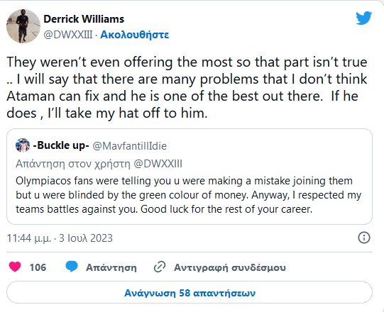 Όλα ξεκίνησαν από… τιτίβισμα φίλου του Ολυμπιακού, ο οποίος υποστήριξε πως αρκετοί ήταν αυτοί που είχαν προειδοποιήσει τον Γουίλιαμς για την επιλογή του, με τον ίδιο, όμως, να ακολουθεί τον… δρόμο του χρήματος.