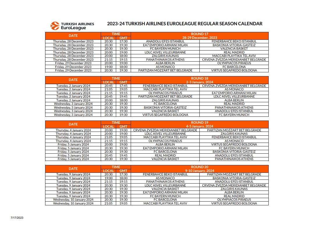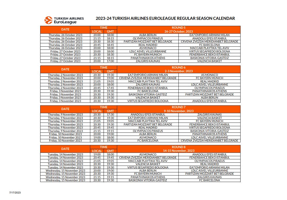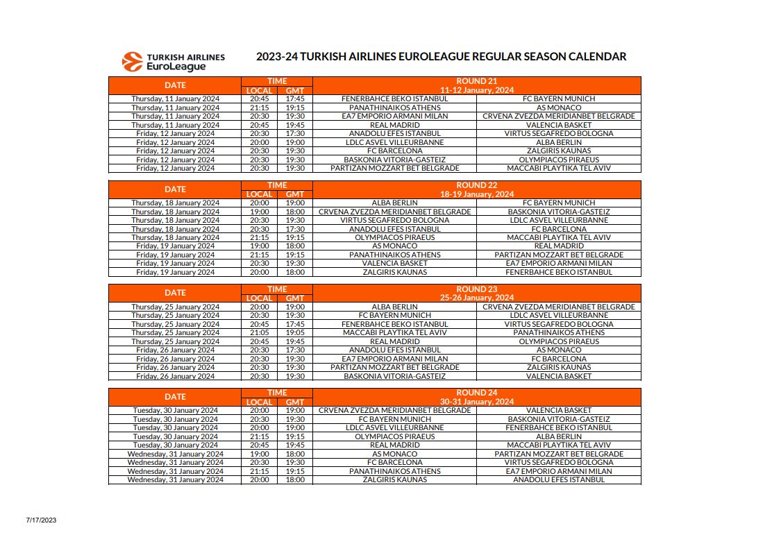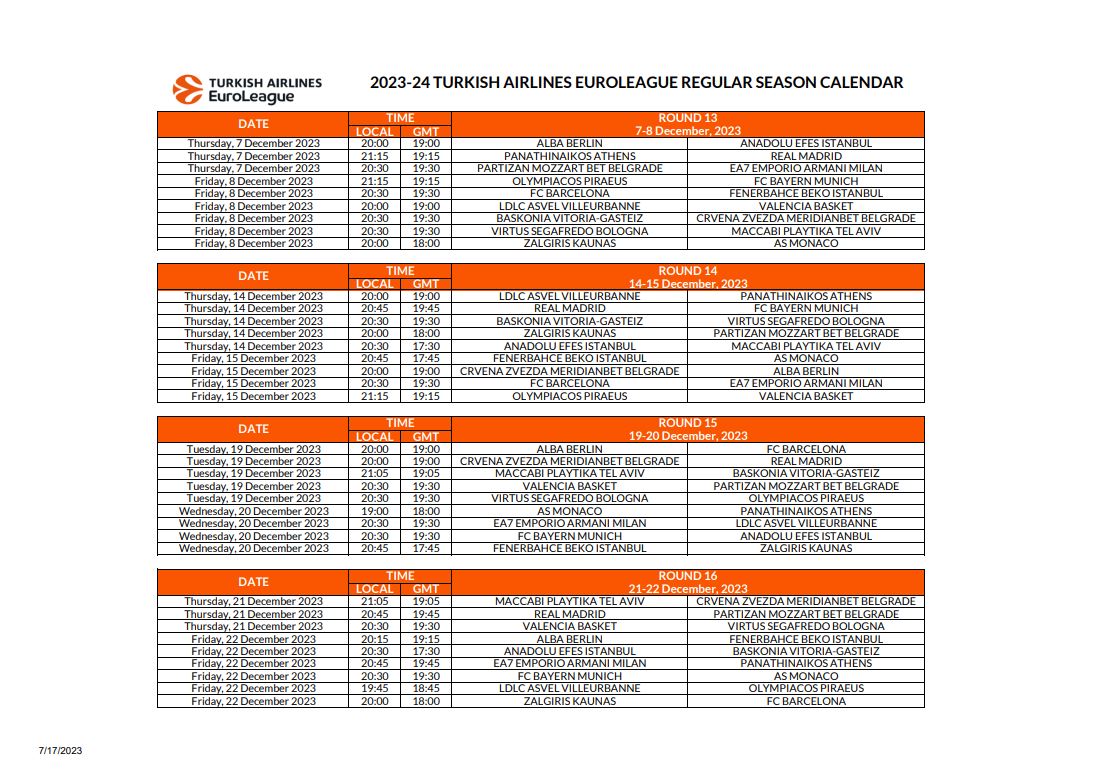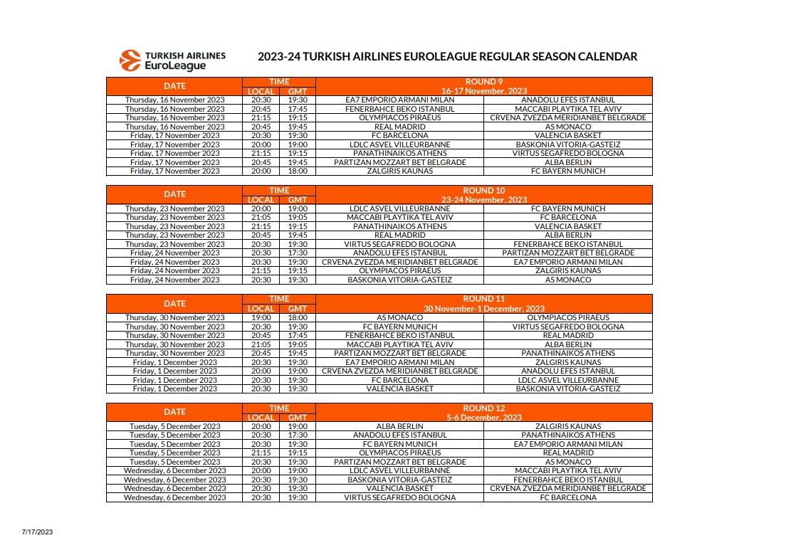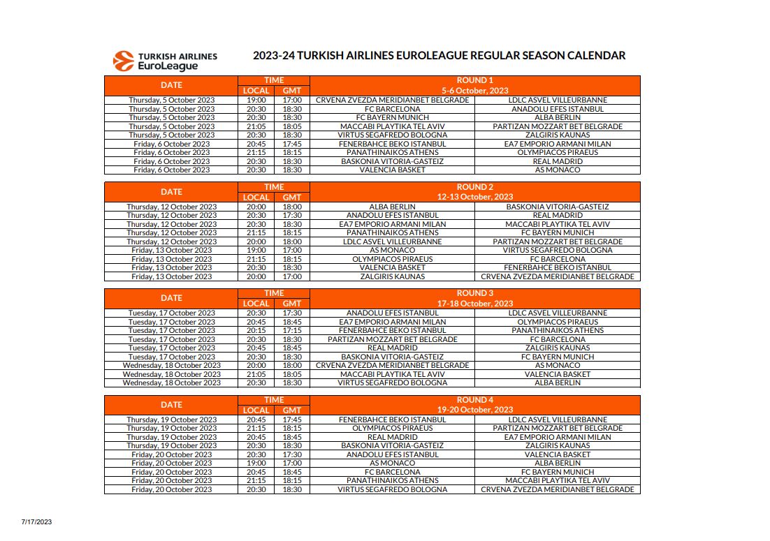 Μετά το πρόγραμμα της πρεμιέρας, από το οποίο ξεχωρίζουν τα παιχνίδια Παναθηναϊκός – Ολυμπιακός και Μπαρτσελόνα – Εφές, η Euroleague έδωσε στην δημοσιότητα το πλήρες καλεντάρι για την σεζόν 2023/24.