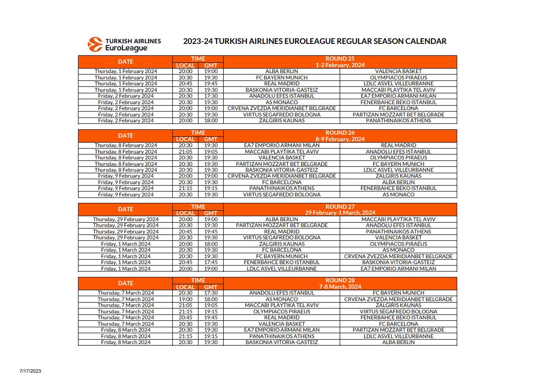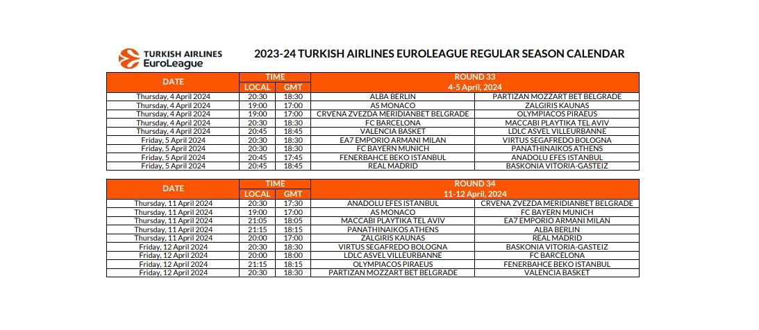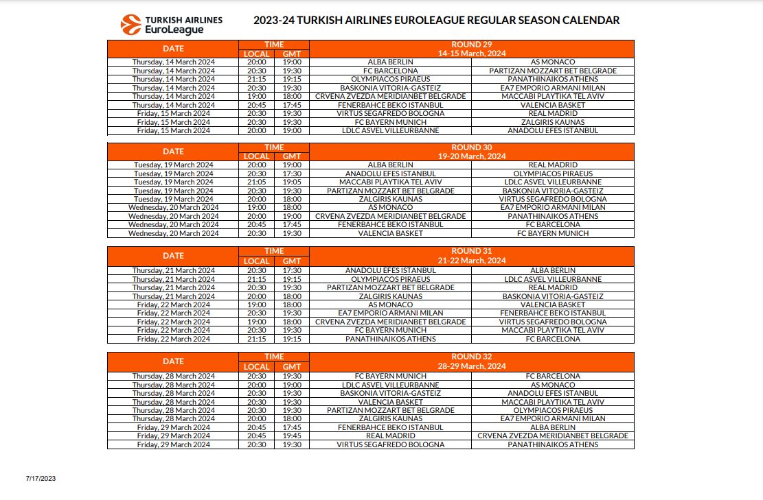 Έτσι βλέπουμε πως η ρεβάνς του ΣΕΦ ανάμεσα στους δύο «αιώνιους» αντιπάλους είναι προγραμματισμένη για την 29η αγωνιστική και τις 14 Μαρτίου 2024, ενώ τόσο Ολυμπιακός, όσο και Παναθηναϊκός, ολοκληρώνουν τις υποχρεώσεις τους για την regular season, εντός έδρας, απέναντι σε Φενέρμπαχτσε και Άλμπα Βερολίνου αντίστοιχα.