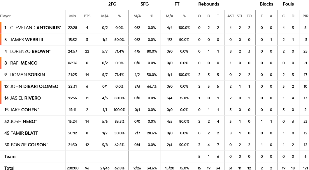 Εξαιρετικός ο Λορέντζο Μπράουν, τελείωσε το ματς με 22 πόντους και οκτώ ασίστ, με τους Σόρκιν και Νίμπο να έχουν από 14 πόντους έκαστος και τον Κόλσον να προσθέτει 12.