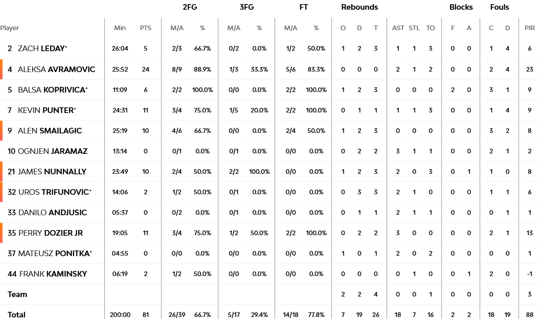 Για την Παρτιζάν, ο Αβράμοβιτς είχε 24 πόντους, με τον Πάντερ να μένει στους 11 πόντους.