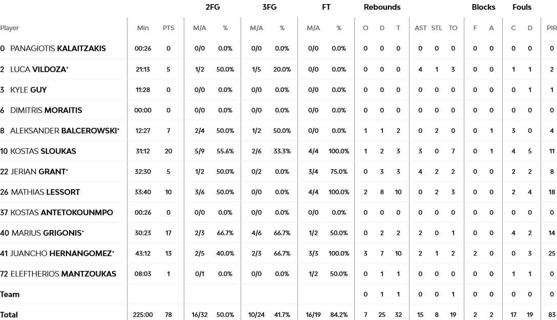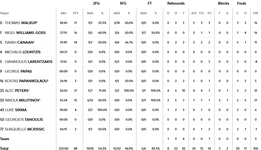 Εκπληκτική εμφάνιση από τον Άλεκ Πίτερς, θύμισε… Σάσα Βεζένκοβ με το double – double που πέτυχε (17 πόντοι, 10 ριμπάουντ). 17 πόντοι ήταν και ο απολογισμός του Γουόκαπ, με τον Γκος να έχει 16 πόντους, τον Μιλουτίνοβ 15 πόντους και επτά ριμπάουντ και τον Κάνααν 14 πόντους.