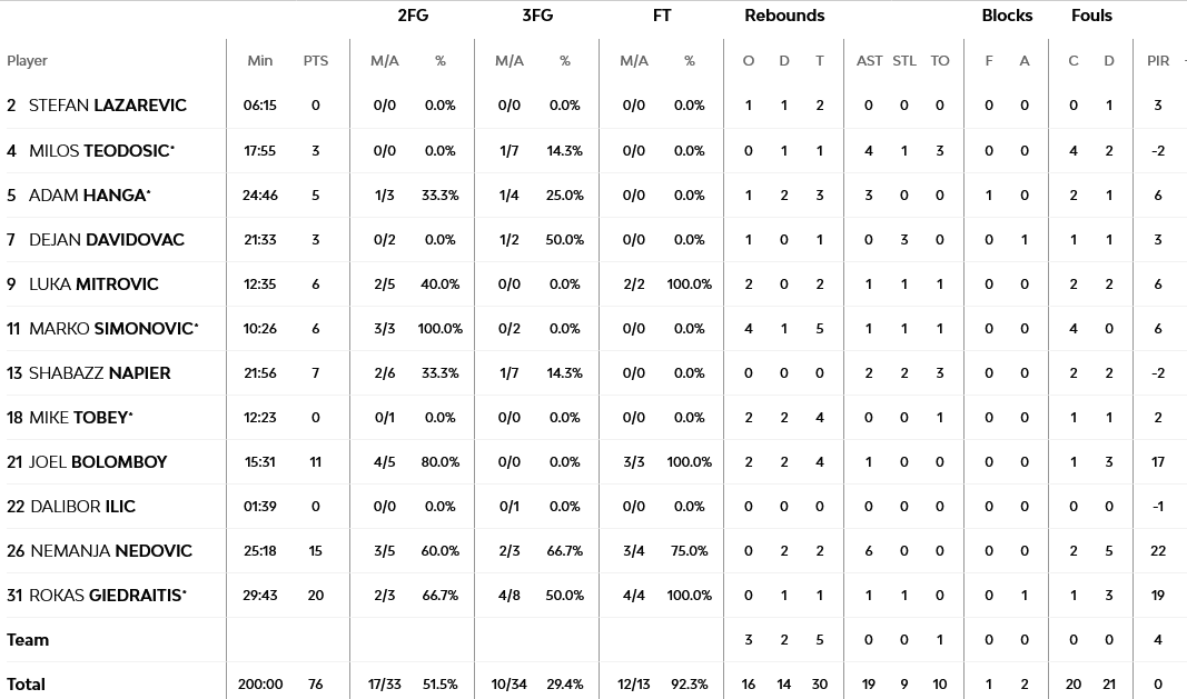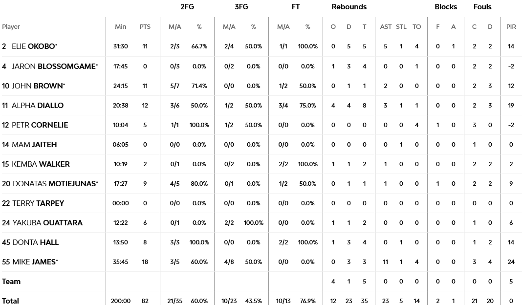 Για τους γηπεδούχους ξεχώρισαν οι Ρόκας Γκεντράιτις με 20 πόντους (4/7 τρίποντα) και Νεμάνια Νέντοβιτς με 15 πόντους και 5 ασίστ. Για τους φιλουξενούμενους ο Τζέιμς ήταν ο MVP με double double (18 πόντοι, 11 ασίστ), ενώ πολύπλευρη ήταν η παρουσία του Έλι Οκόμπο με 11 πόντους, 5 ριμπάουντ και 5 ασίστ.