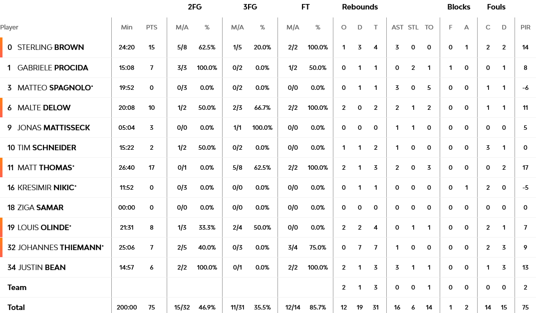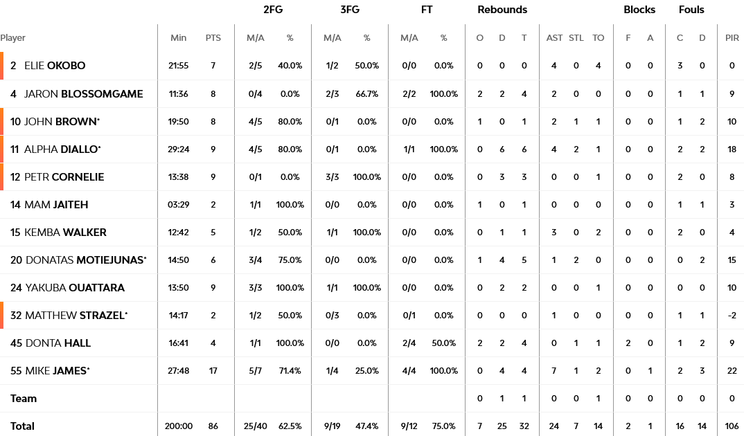 17 πόντους και επτά ασίστ είχε ο Μάικ Τζέιμς, με τον Κέμπα Γουόκερ να τελειώνει το ματς με πέντε πόντους και τρεις ασίστ και την Μονακό να έχει όλους τους παίκτες της στον πίνακα των σκόρερ. Από πλευράς Άλμπα, 17 πόντους είχε ο Τόμας και 15 ο Μπράουν.