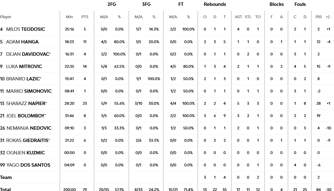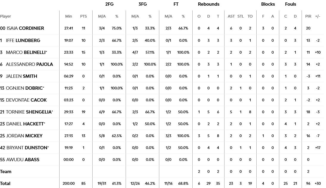 Ο Τόκο Σενγκέλια με 19 πόντους, 6 ριμπάουντ και 5 ασίστ και ο Μάρκο Μπελινέλι με 15 πόντους (4/7 τρίποντα) ξεχώρισαν για τους νικητές. Για τους ηττημένους ο Νέιπιερ με 23 πόντους, 4 ριμπάουντ και 5 ασίστ προσπάθησε πολύ, όπως και ο Μίτροβιτς με 14 πόντους.