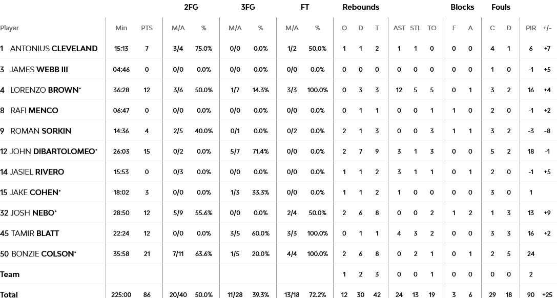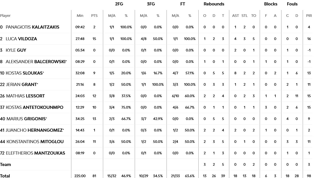 Ξεχώρισαν: Double – double έκανε ο Μπράουν με 12 πόντους και ισάριθμα ριμπάουντ, με τον ΝτιΜπαρτολομέο να έχει 15 πόντους και εννιά ριμπάουντ. Για τον Παναθηναϊκό, Βιλντόσα και Γκριγκόνις είχαν 15 και 13 πόντους αντίστοιχα.