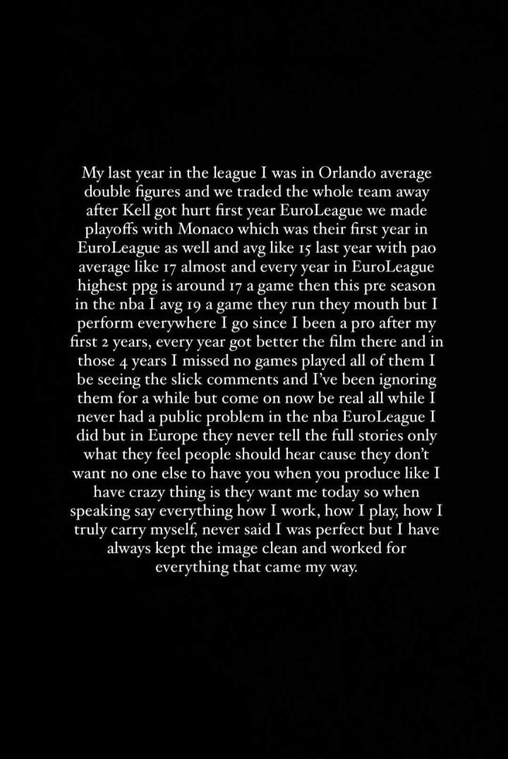 Στην preseason του ΝΒΑ φέτος είχα 19 πόντους. Ανοίγουν το στόμα τους, αλλά όπου κι αν πάω στην καριέρα μου, αποδίδω, κάθε χρόνο γίνομαι καλύτερος. Τα VIDEO υπάρχουν και σε αυτά τα τέσσερα χρόνια δεν έχω χάσει κανένα ματς. Δέχομαι άσχημα σχόλια όλο αυτόν τον καιρό, αλλά ελάτε τώρα, σοβαρευτείτε. Ενώ στο ΝΒΑ δεν είχα κάποιο δημόσιο πρόβλημα, στην Ευρωλίγκα είχα. Αλλά στην Ευρώπη δεν λένε ποτέ ολόκληρη την ιστορία, μόνο ό,τι νιώθουν πως κόσμος πρέπει να ακούσει, γιατί δεν θέλουν σε πάρει κάποιος άλλος όταν είσαι τόσο παραγωγικός όσο εγώ.