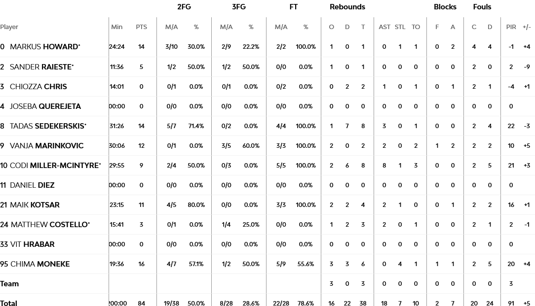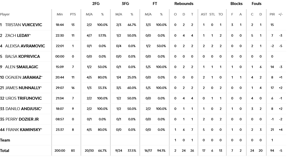 Για τους νικητές ξεχώρισε ο Τσίμα Μονέκε με 16 πόντους και 6 ριμπάουντ, όπως και ο Τάντας Σεντέρσκις με 14 πόντους και 8 ριμπάουντ. Για τους ηττημένους ο Νάναλι με 16 πόντους και ο Ζακ Λεντέι με 11 δεν απέτρεψαν την ήττα της ομάδας τους.