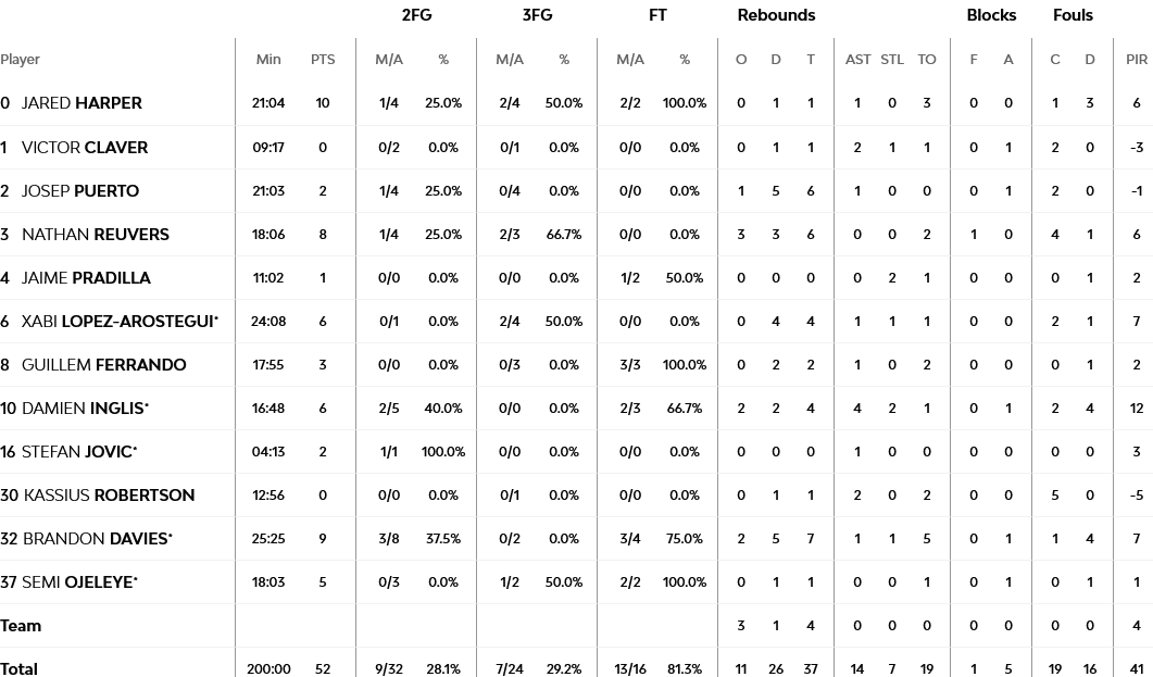 19 πόντοι και επτά ριμπάουντ ήταν ο απολογισμός του Μίροτιτς που έκανε… παπάδες στο πρώτο μισό, με τον Λο να προσθέτει 10 πόντους, ενώ για την Βαλένθια, ο Χάρπερ με 10 πόντους ήταν ο μοναδικό διψήφιος των φιλοξενούμενων.