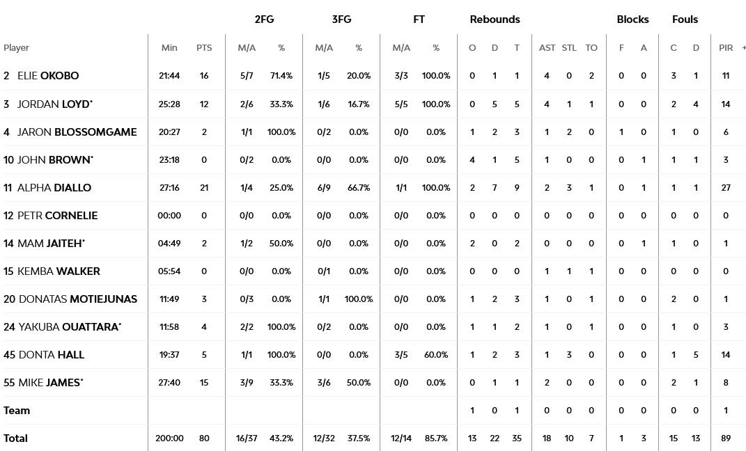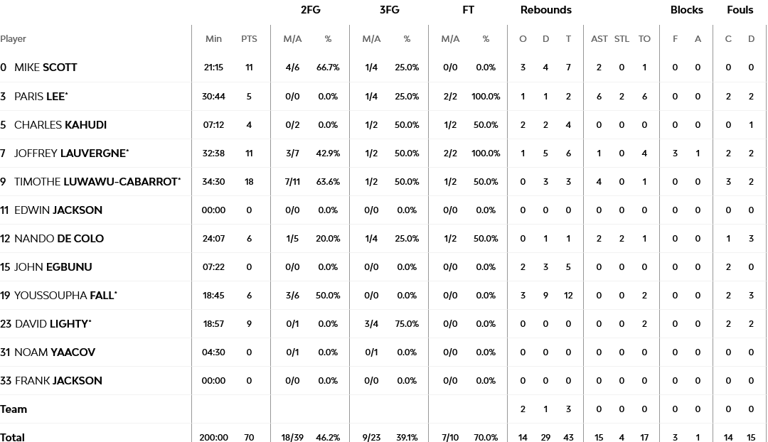 21 πόντους και εννιά ριμπάουντ είχε ο εξαιρετικός Ντιαλό, με τον Τζέιμς να ακολουθεί με 15 πόντους, ενώ ο Οκόμπο είχε 16. Για την Βιλερμπάν, 18 πόντους είχε ο Λουβαβού – Καμπαρό και από 11 οι Σκοτ και Λοβέρν.