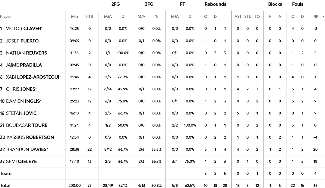 17 πόντους σημείωσε ο Ντεκ, με τον Καμπάτσο να προσθέτει 15 πόντους, ενώ για την Βαλένθια, 22 πόντους σημείωσε ο Ντέιβις.