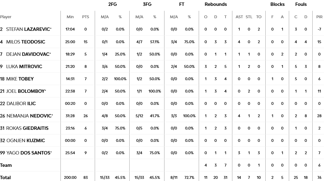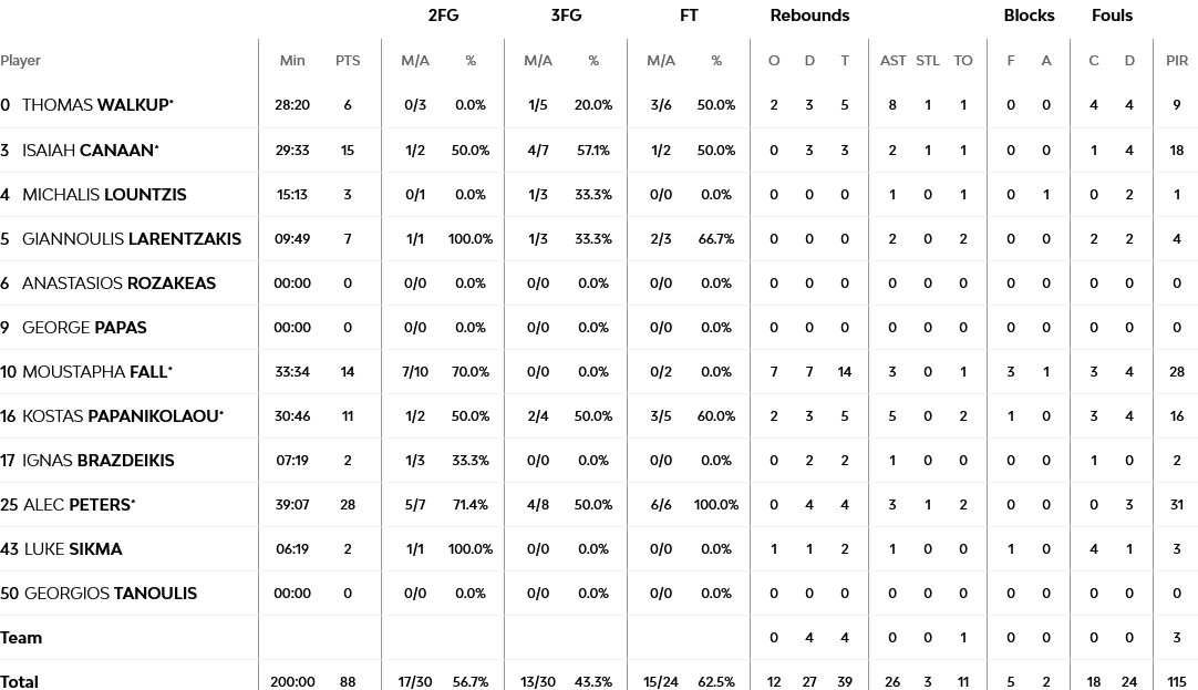 Ξεχώρισαν: Σαρωτικός ο Φαλ με 14 πόντους και ισάριθμα ριμπάουντ. Από πλευράς Αστέρα, ο Νέντοβιτς είχε 26 πόντους και ο Τεόντοσιτς 15.