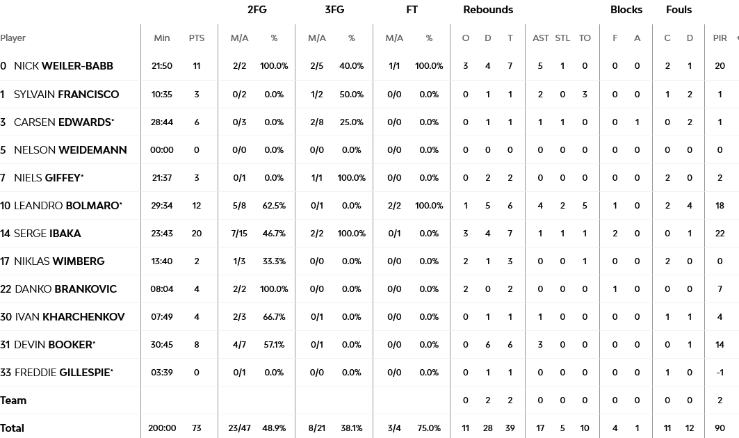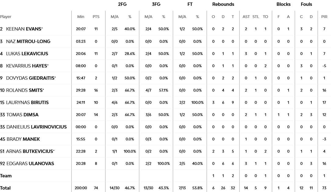 Ο Σμιτς με 16 πόντους ήταν ο πρώτος σκόρερ της Ζαλγκίρις, με τον Ντίμσα να έχει 14, τους Έβανς και Λεκαβίτσιους από 11, ενώ ο Μπιρούτις… άγγιξε το double – double με 10 πόντους και εννέα ριμπάουντ. Από πλευράς Μπάγερν, ο Ιμπάκα ήταν απολαυστικός με 20 πόντους, ανάμεσα τους και το τρίποντο που έφερε την ομάδα του δευτερόλεπτα μακριά από το «διπλό», με τον… μοιραίο Μπολμάρο (αστόχησε στο σουτ στο φινάλε) να έχει 12 και τον Γουάιλερ – Μπαμπ 11 πόντους.