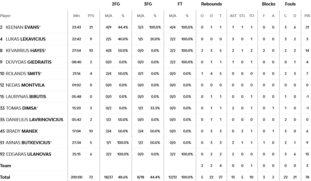Ξεχώρισαν: Απολαυστικός για ακόμα ένα ματς ο Πίτερς με 22 πόντους (4/5 τρίποντα) και έξι ριμπάουντ, ενώ για την Ζαλγκίρις, ο Έβανς είχε 21 πόντους.