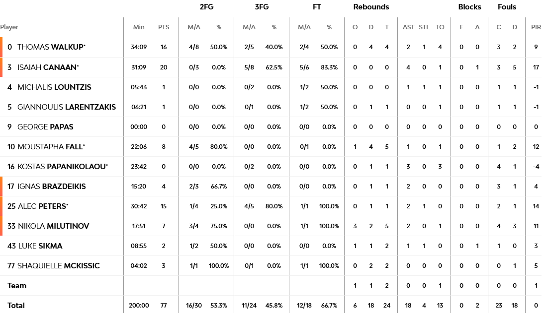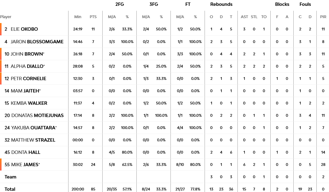Ξεχώρισαν: 20 πόντους με 5/8 τρίποντα είχε ο Κάνααν, με τον Πίτερς να έχει 15 πόντους με 4/5 τρίποντα και τον Γουόκαπ 16 πόντους. Για την Μονακό, ο Οκόμπο είχε 11 πόντους.