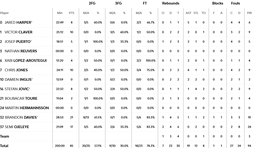 Ντέιβις με 21 πόντους και Οτζελέγε με 17, ήταν οι κορυφαίοι της Βαλένθια, ενώ από πλευράς Ερυθρού Αστέρα, Νέντοβιτς και Νέιπιερ είχαν από 14 πόντους έκαστος.