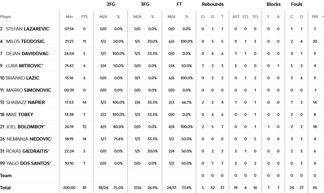 Σε παράσταση για έναν ρόλο μετέτρεψαν οι γηπεδούχοι το πρώτο ημίχρονο της αναμέτρησης. Η Βαλένθια έβλεπε σαν… βαρέλι το καλάθι των Σέρβων, πετυχαίνοντας 25 πόντους στην πρώτη περίοδο και 31 στην δεύτερη, πηγαίνοντας στα αποδυτήρια, για την ανάπαυλα του ημιχρόνου, με προβάδισμα 16 πόντων (56-40).