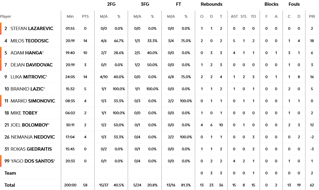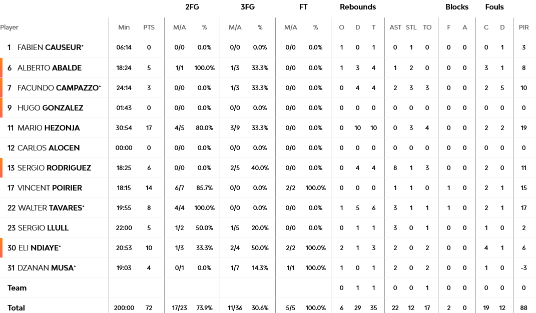 Αυτός που ηγήθηκε της Ρεάλ ήταν ο Χεζόνια με δεσποτική εμφάνιση αφού σημείωσε double double 17 πόντους και 10 ριμπάουντ, ενώ από τους γηπεδούχους από 14 πόντους είχαν Μίτροβιτς και Τεόντοσιτς.