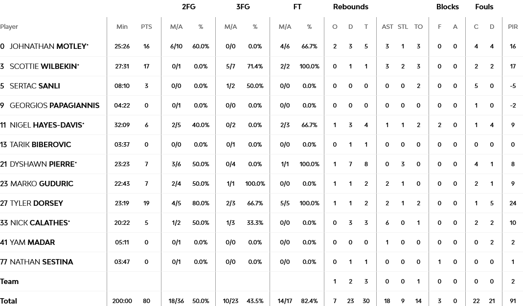 Καθοριστικός ο Τάιλερ Ντόρσεϊ με 19 πόντους (4/5 δίποντα, 2/3 τρίποντα, 5/5 βολές), με τον Γουίλμπεκιν να έχει 17 πόντους και τον Μότλεϊ 16. Για την Ζαλγκίρις, 19 πόντους σημείωσε ο Έβανς, ενώ ο Σμιτς είχε 16 πόντους και εννέα ριμπάουντ.