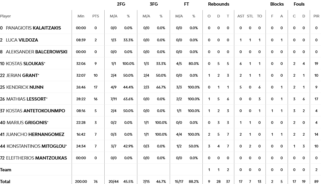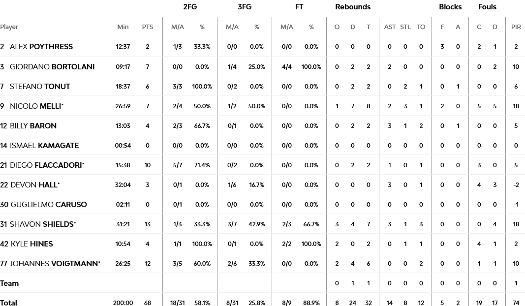 Ξεχώρισαν: 16 πόντους και έξι ριμπάουντ είχε ο Λεσόρ, που αποχώρησε τραυματίας λίγο πριν το φινάλε, ο Γκραντ είχε 10 πόντους, ενώ Χουάντσο και Μήτογλου είχαν από επτά πόντους και ριμπάουντ. Για την Αρμάνι, ο Σιλντς είχε 13 πόντους και επτά ριμπάουντ, με τον Βόιτμαν να έχει 12 πόντους και τον Φλακαντόρι 10.