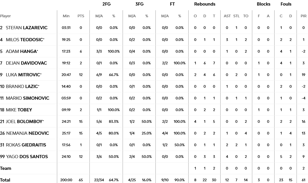 Ξεχώρισαν: Γκραντ και Λεσόρ είχαν 14 και 13 πόντους αντίστοιχα, ενώ για τον Αστέρα, Μπολομπόι και Νέντοβιτς είχαν από 15 πόντους και Μίτροβιτς με Ντος Σάντος από 12.