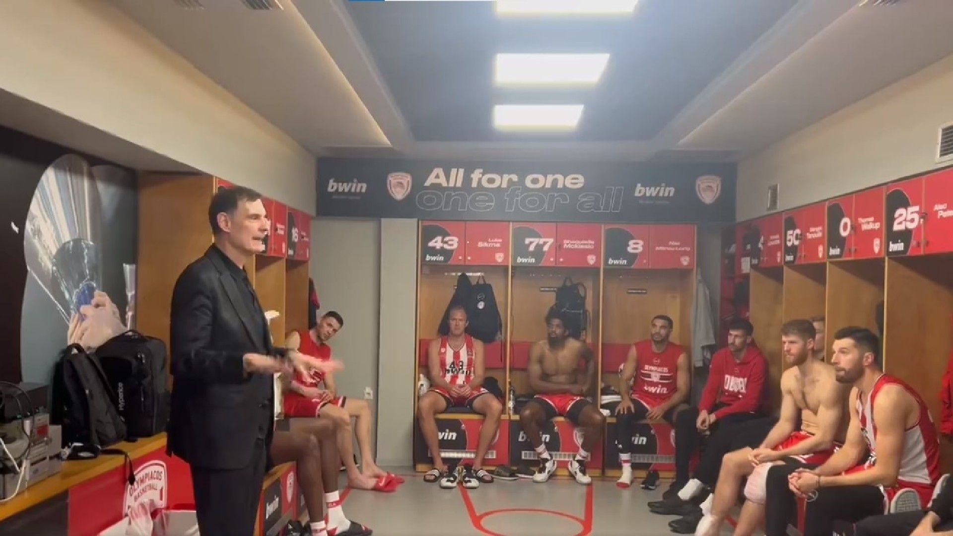 Ο Ολυμπιακός έχει νικήσει την Αρμάνι Μιλάνο με 79-74 και λίγα λεπτά αργότερα ο Γιώργος Μπαρτζώκας αποθεώνει τους παίκτες του στα αποδυτήρια, με τον Έλληνα τεχνικό να εξάρει την προσπάθεια των αθλητών του.