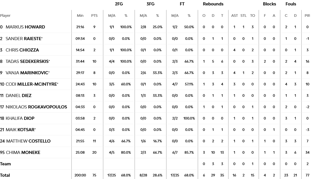 Ξεχώρισαν: 25 πόντους είχε ο «καυτός» Ναν, που αστόχησε, όμως, στα δύο συνεχόμενα τρίποντα στο φινάλε, που θα… κλείδωναν την νίκη για τον Παναθηναϊκό. Από 11 πόντους είχαν Σλούκας και Γκριγκόνις, ενώ για την Μπασκόνια, ο Κοστέλο είχε 11 πόντους, ενώ ο ήρωας Μάκϊνταϊρ 10, όσους σημείωσε και ο Σεντεκέρσκις.