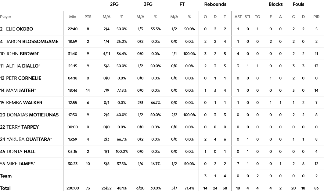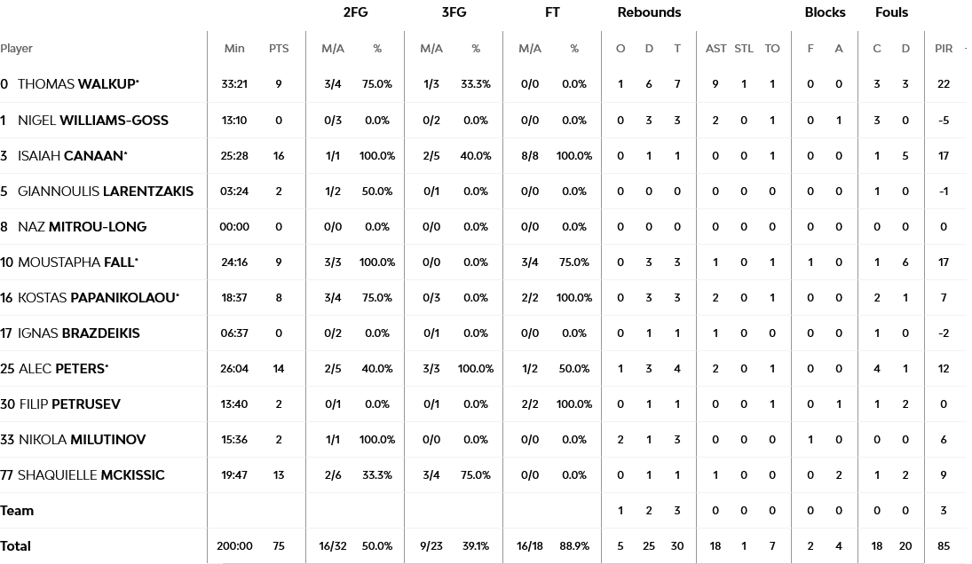 Ξεχώρισαν: 14 πόντους σημείωσε ο Πίτερς και 13 ο ΜακΚίσικ, ανάμεσα τους το μεγάλο τρίποντο για το +3 στα 22’’, ενώ ο Γουόκαπ πλησίασε το triple double με εννιά πόντους, ισάριθμα ριμπάουντ και επτά ασίστ. Για την Μονακό, 14 πόντους είχε ο Τζαιτέ και 10 ο Τζέιμς.