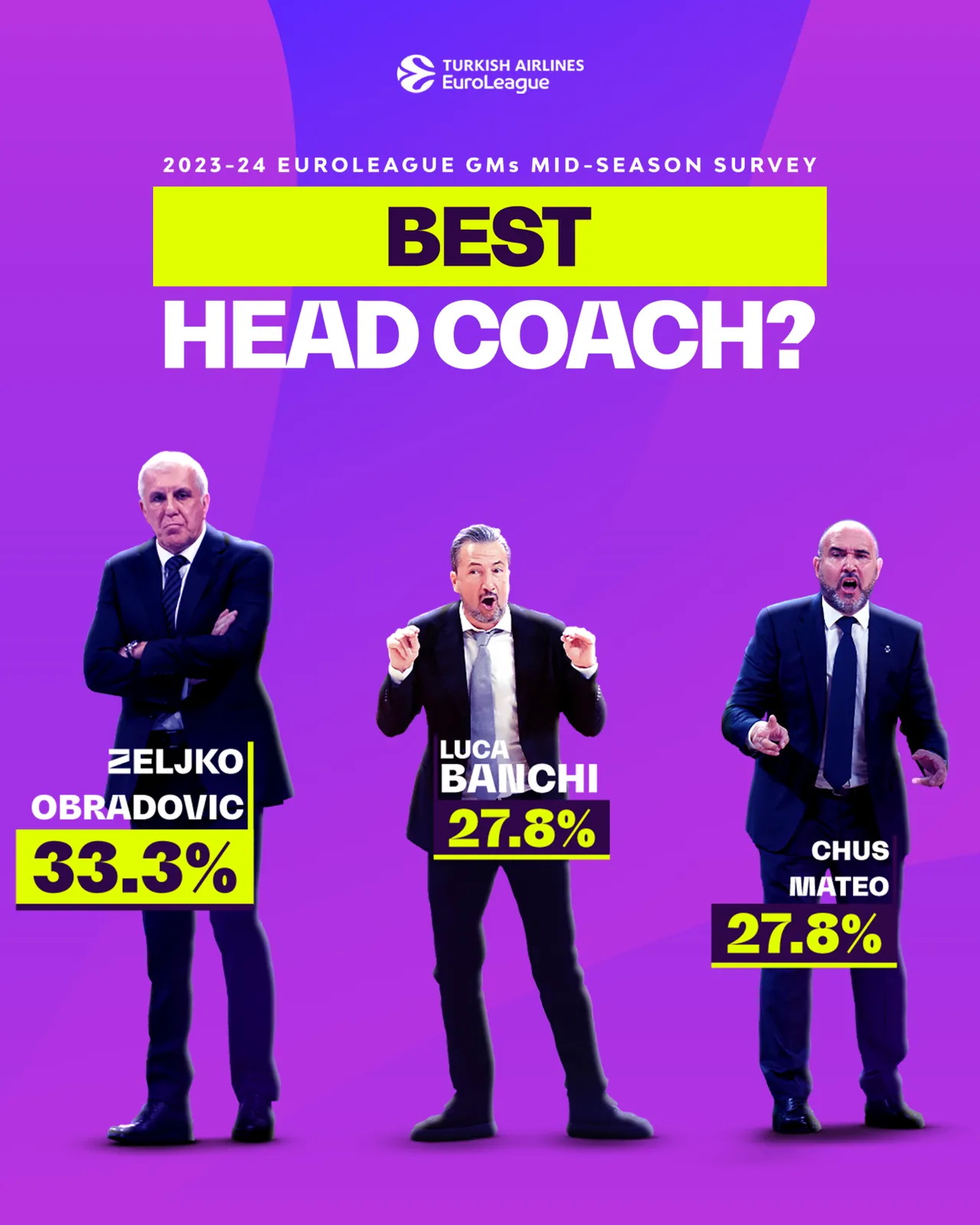 Τέλος, όσον αφορά τους κορυφαίους προπονητής, ο Ζέλικο Ομπράντοβιτς συγκέντρωσε 33,3%, ο Λούκα Μπάνκι 27,8%, ποσοστό που έχει και ο Τσους Ματέ.