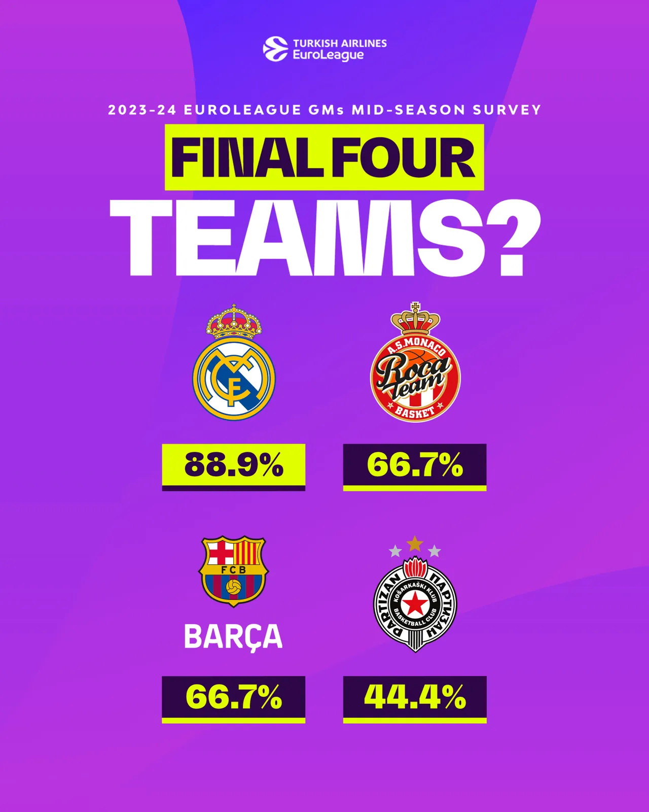 Όσον αφορά της ομάδες που οι GM βλέπουν στο Final Four, αυτές είναι οι Ρεάλ Μαδρίτης (88,9%, Μονακό (66,7%), Μπαρτσελόνα (66,7%) και Παρτιζάν (44,4%).